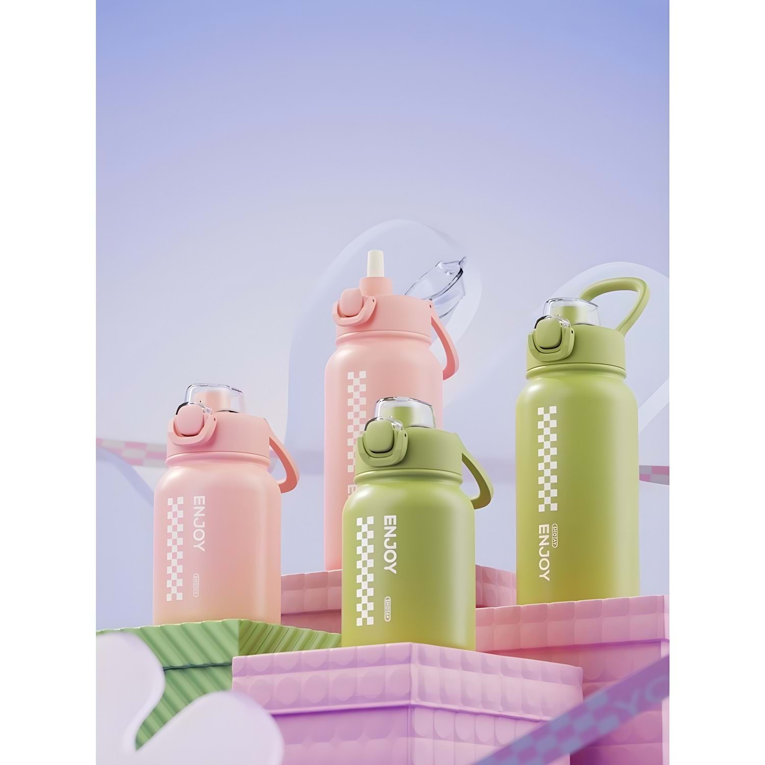 Enjoy matara serisi, pastel tonları ve ergonomik tasarımıyla içeceklerinizi güvenle taşımanızı sağlar. Pipetli kapağı sayesinde kolay içim sunar, sızdırmaz yapısı sayesinde çantanızda dökülme riski yoktur.