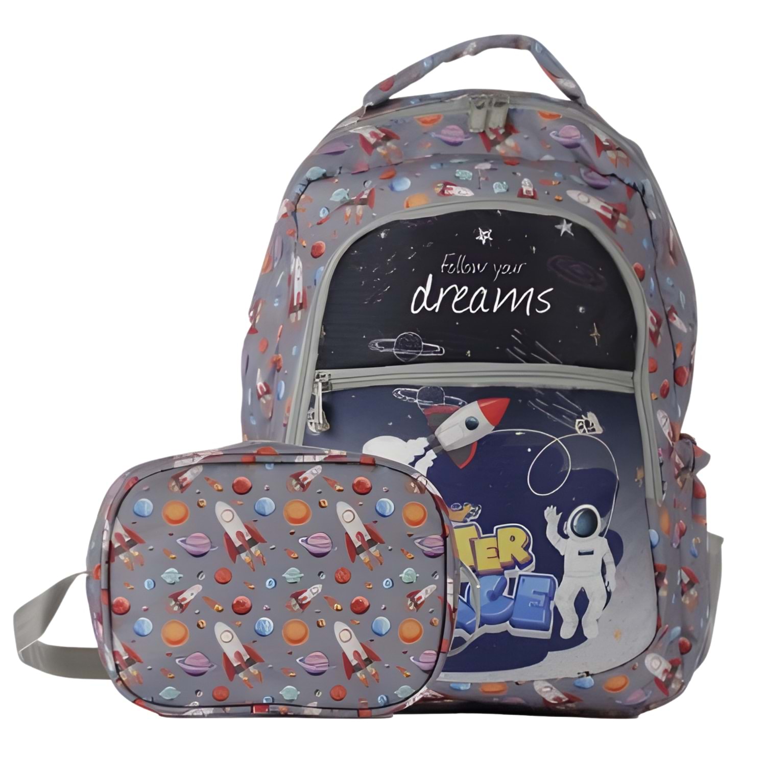 outer space okul çantası, uzay temalı çanta, astronot desenli çanta, pippa çanta, gri okul çantası, beslenme çantalı set, çocuk çanta seti, roketli okul çantası, dayanıklı çocuk çantası, erkek çocuk okul çantası