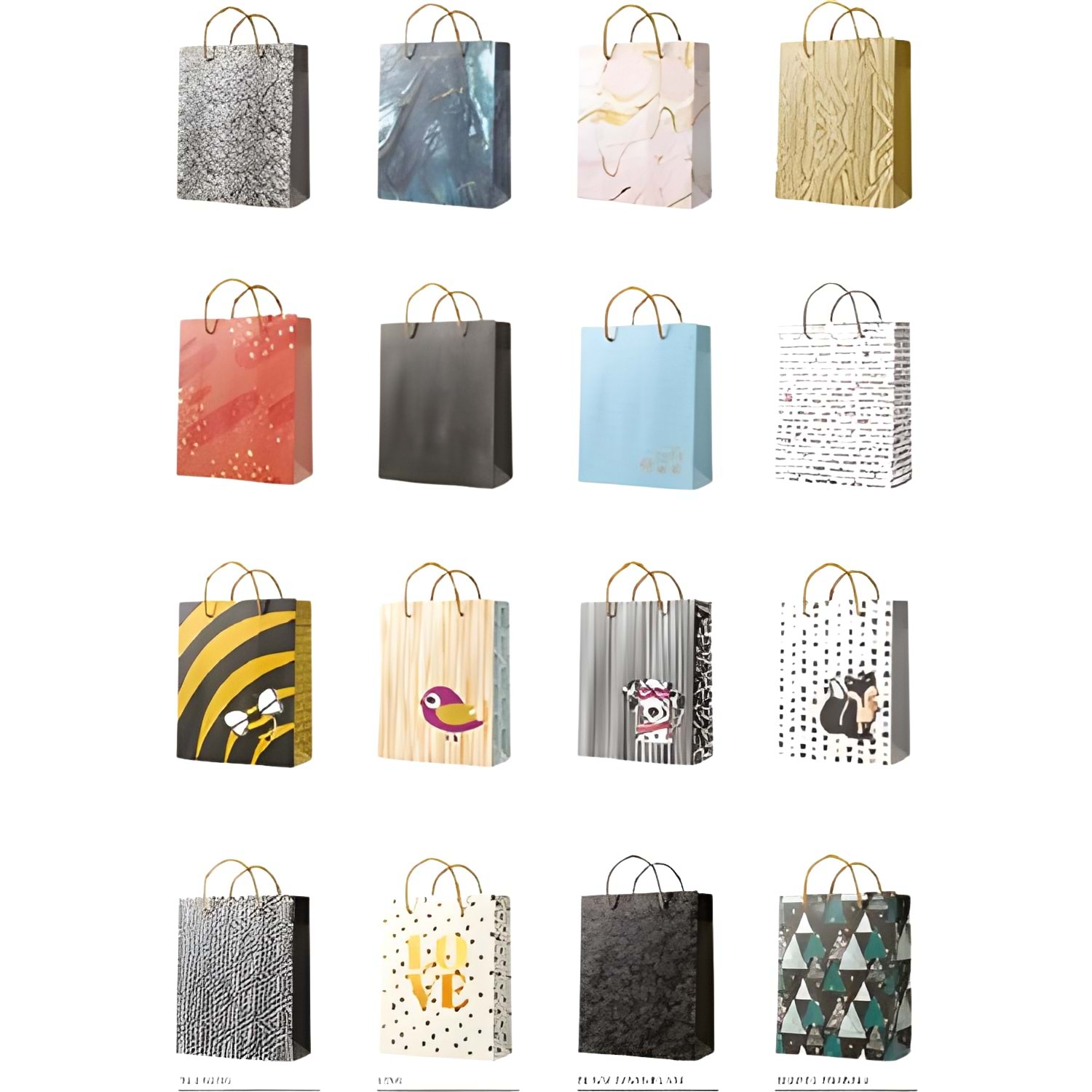 Renkli ve modern tasarımlara sahip bu desenli hediye çantaları, hediyelerinize zarif bir dokunuş katar.