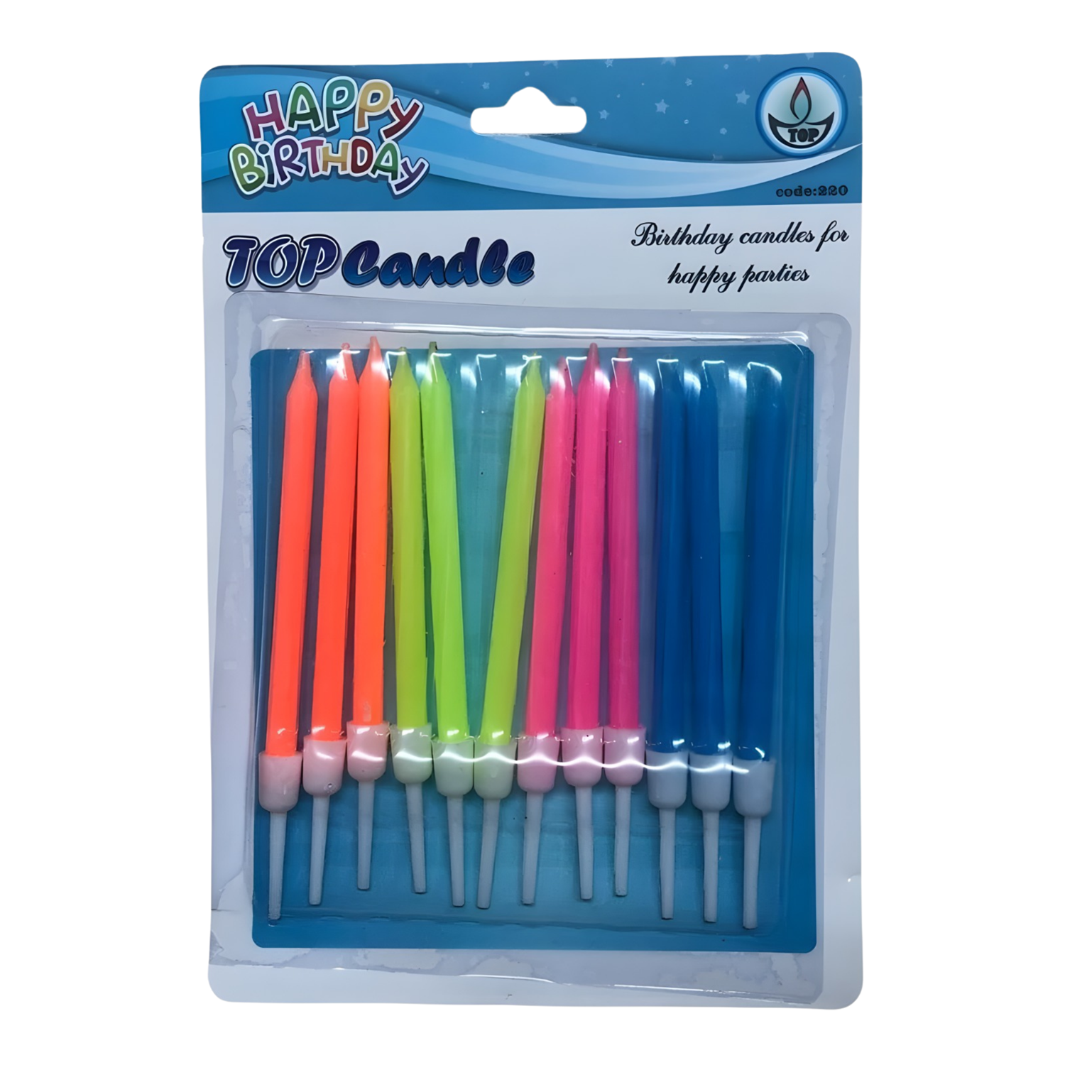 KOD 220 renkli mum 12’li paket; doğum günü ve özel gün pastaları için canlı renklerde, kullanımı kolay ve şık mum setidir.