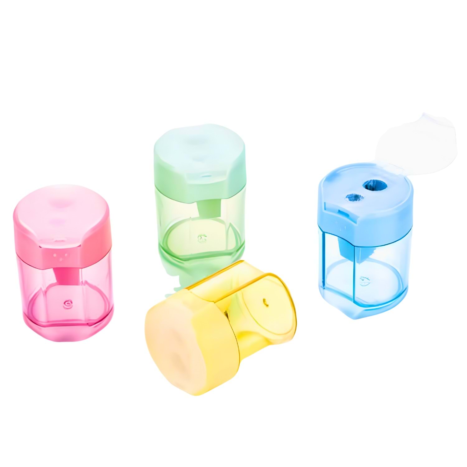 Rainbow Çift Hazneli Kalemtıraş, modern şeffaf tasarımı ve pastel tonlarıyla hem şık hem de işlevsel bir kırtasiye ürünüdür.