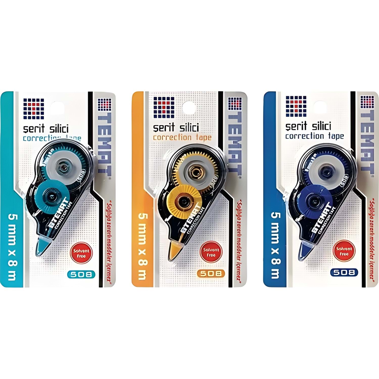 temat şerit silici, correction tape, 5mm 8m şerit silici, temat 508, solvent free silici, ofis malzemesi, okul kırtasiye silici, hatalı yazı düzeltici, şerit tipi silgi