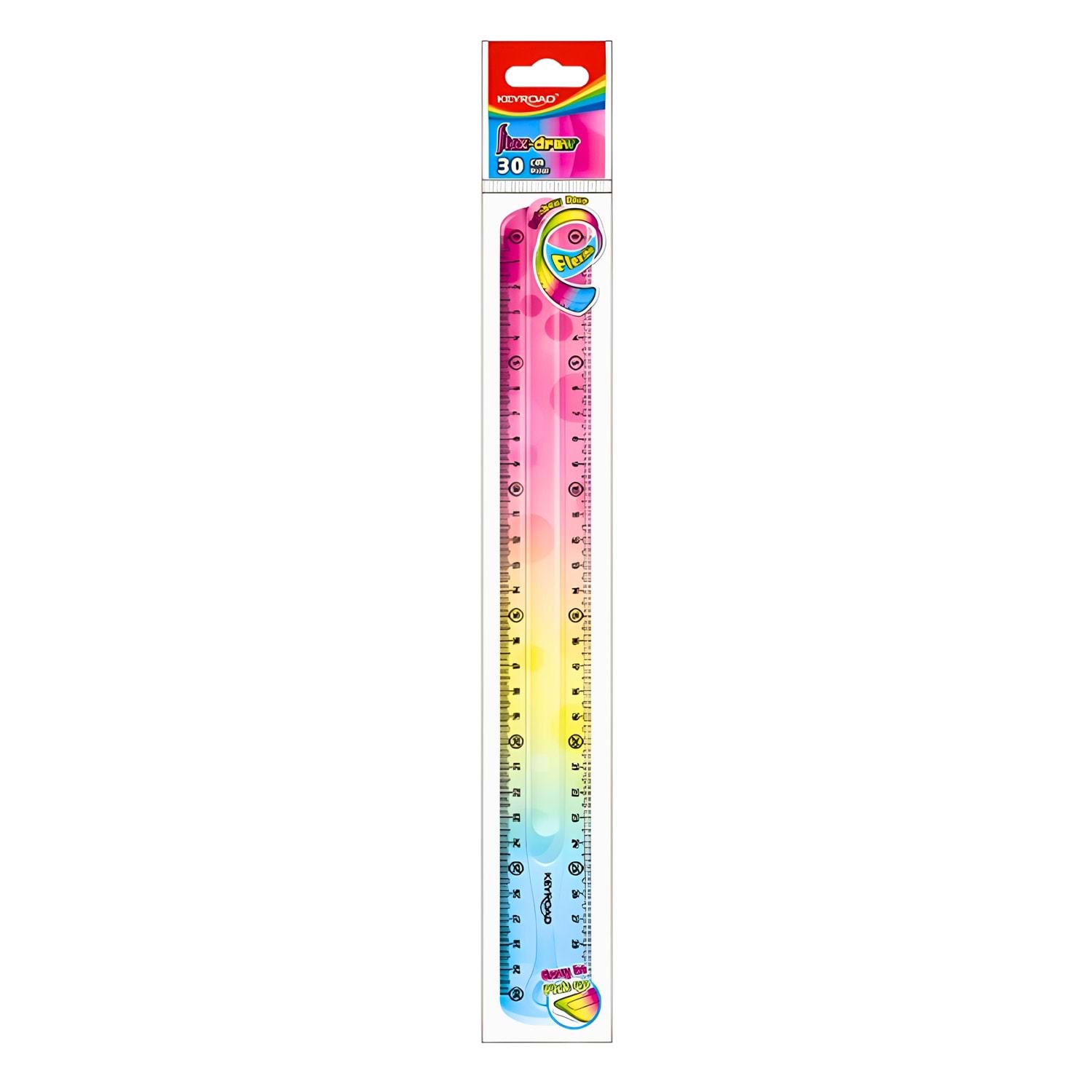 Keyroad Flexible 30 cm Renkli Cetvel, eğilebilir ve kırılmaya dayanıklı yapısıyla hem öğrenciler hem de yetişkinler için ideal bir ölçüm aracıdır. Esnek silikon benzeri malzemeden üretilen bu cetvel, çantalarda kırılmadan taşınabilir ve uzun süreli kullanımda formunu kaybetmez. Canlı, geçişli renkleri sayesinde hem estetik hem de eğlenceli bir tasarım sunar.
