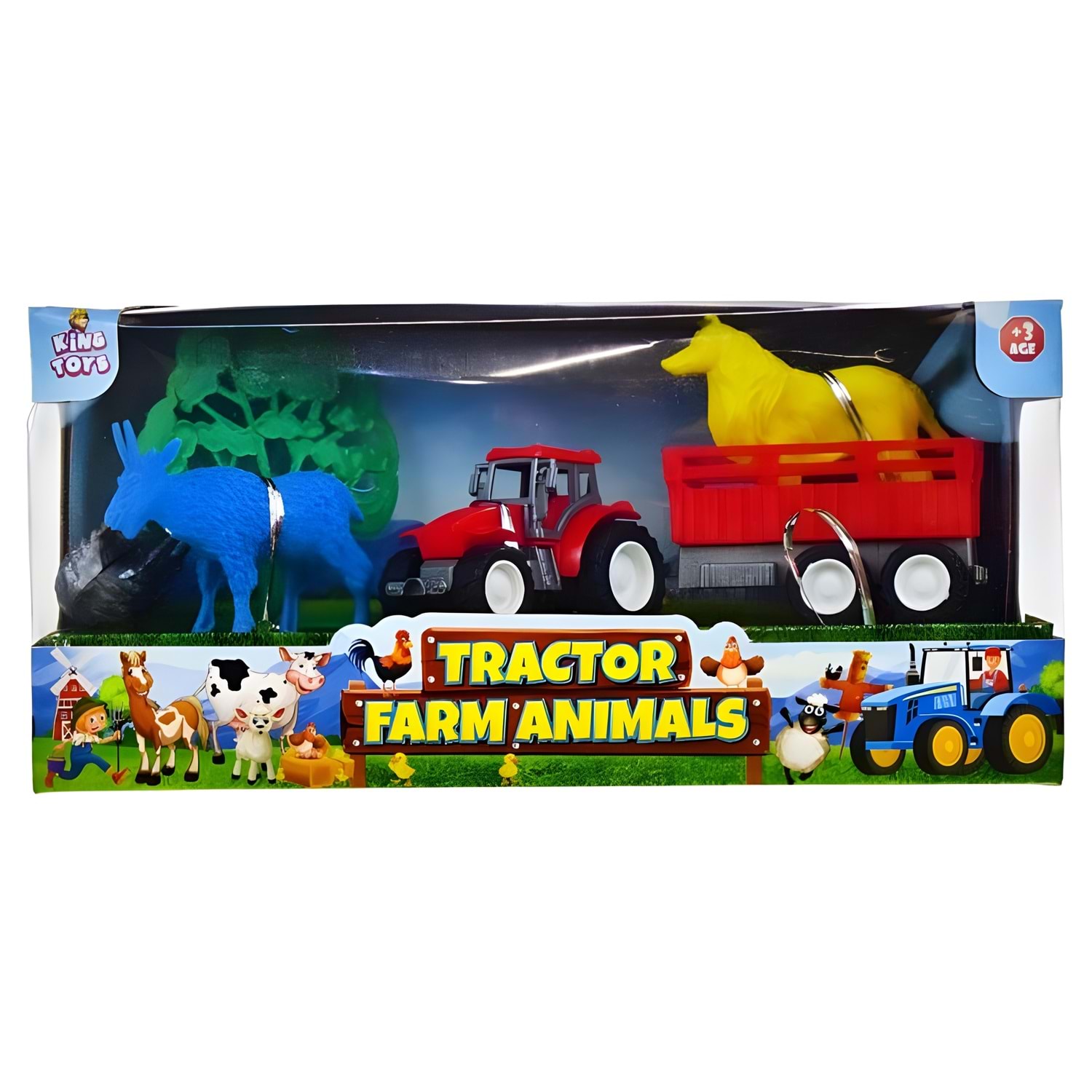Kutu içerisinde traktör, römork, hayvan figürleri ve ağaç yer alır.