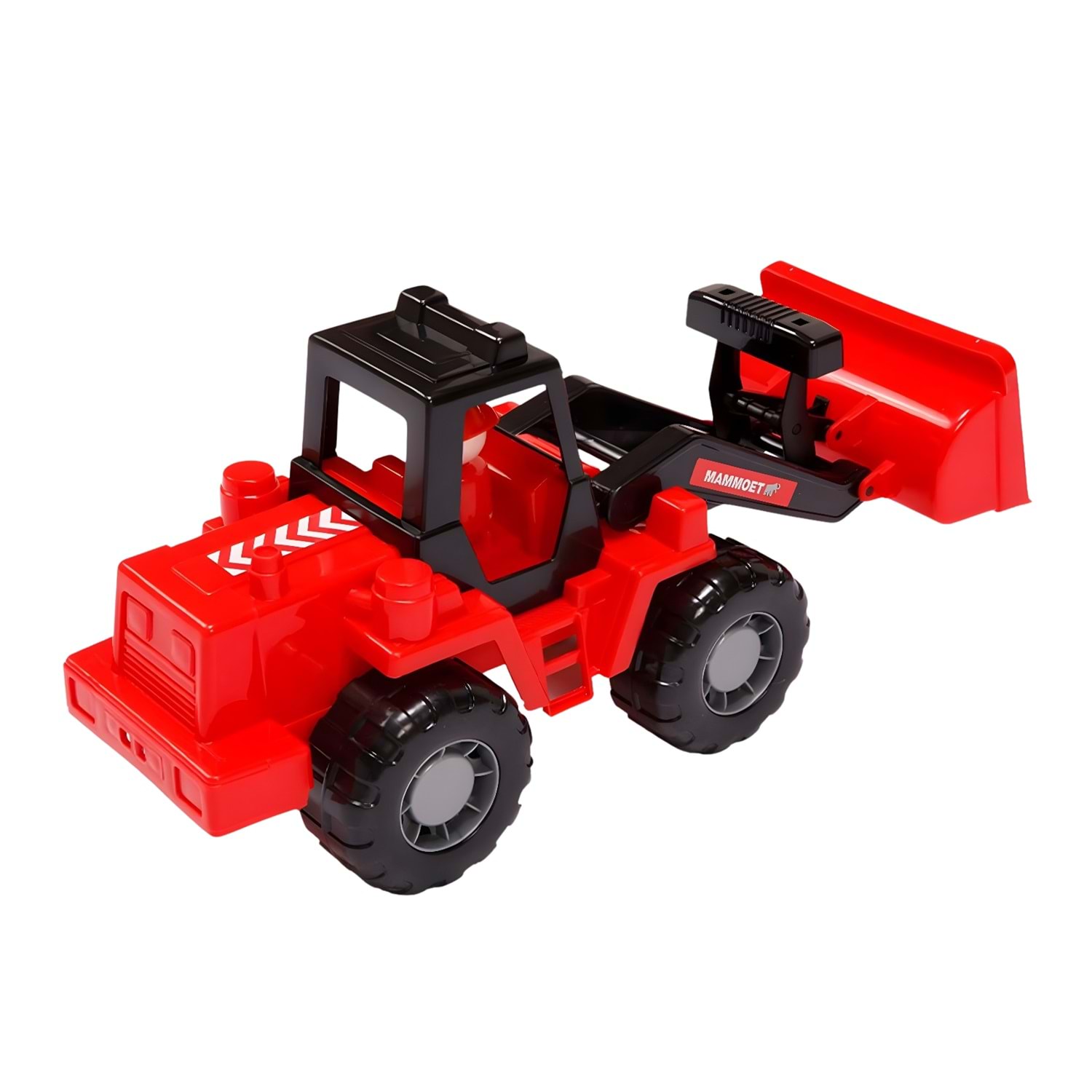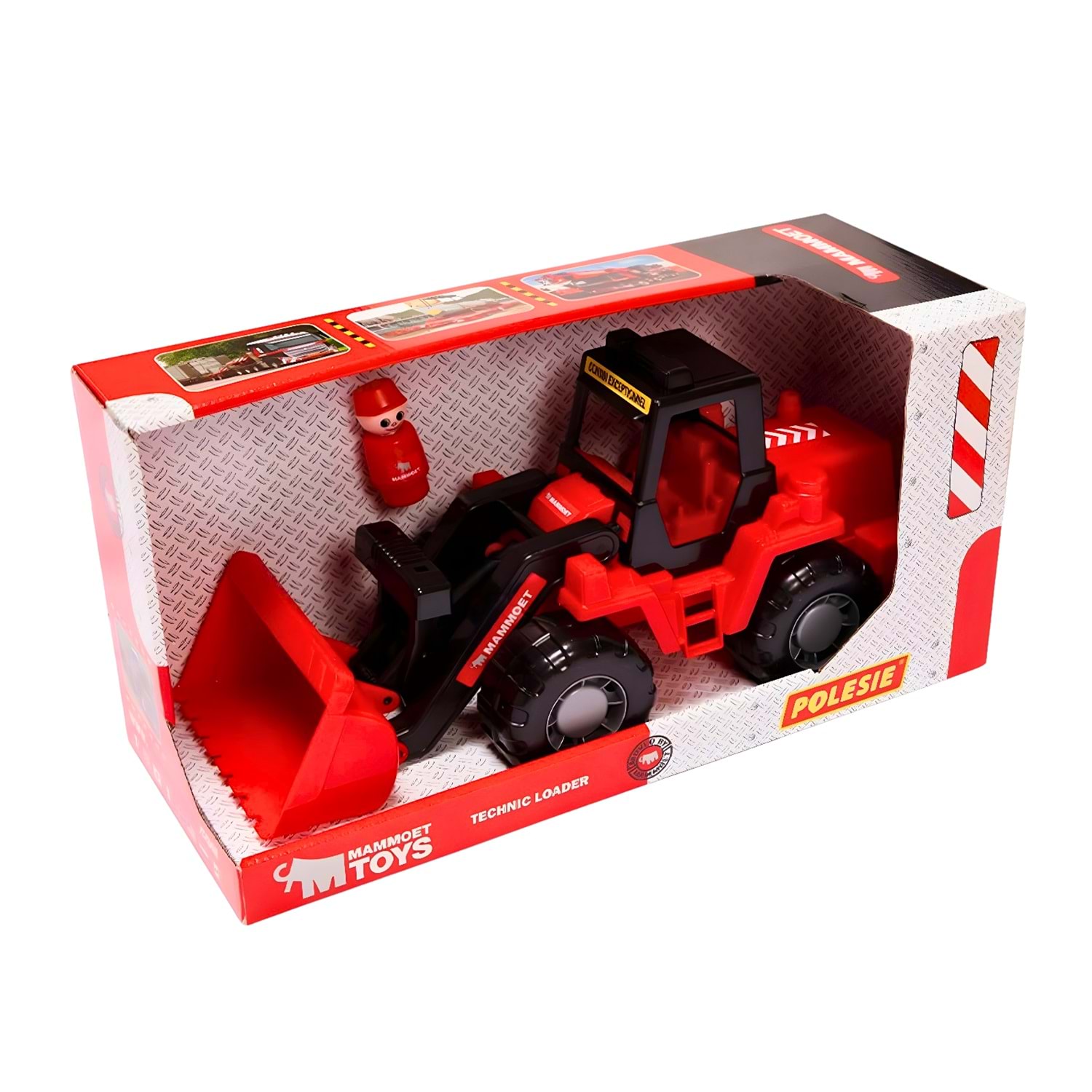 Polesie Mammoet Teknik Traktör Yükleyici, gerçek iş makinelerinden esinlenerek tasarlanmış kırmızı kepçeli bir oyuncaktır.