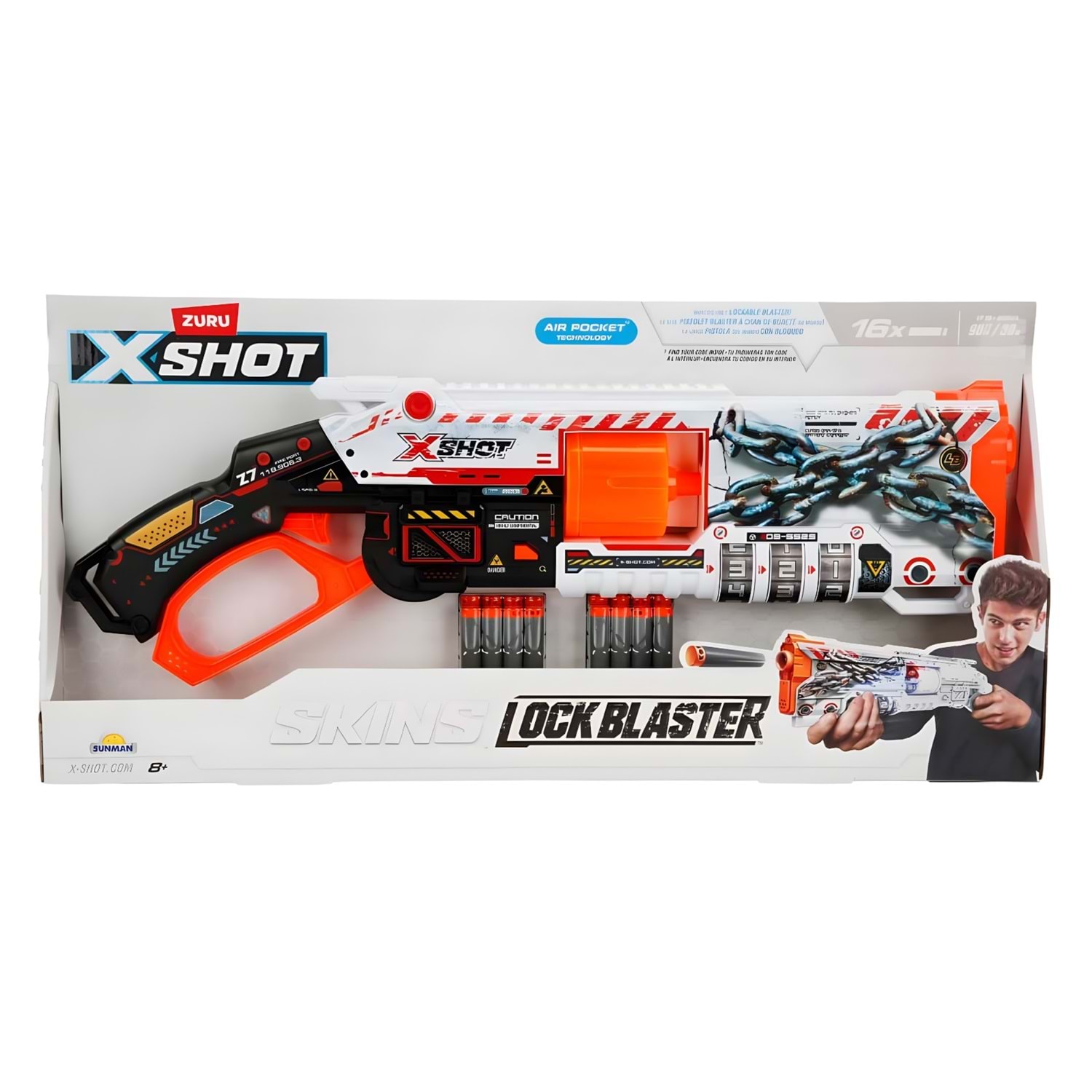 Zuru X-Shot Skins Lock Blaster 16’lı Sünger Dart Tabancası – Air Pocket Teknolojili Oyuncak Silah, 27 Metre Menzil