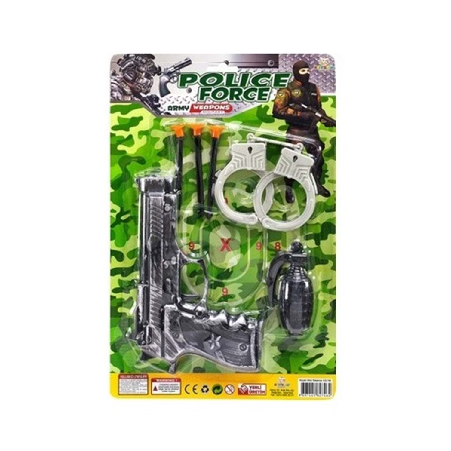Set İçeriği: Oyuncak tabanca, kelepçe, el bombası figürü, mermi görünümlü aksesuarlar