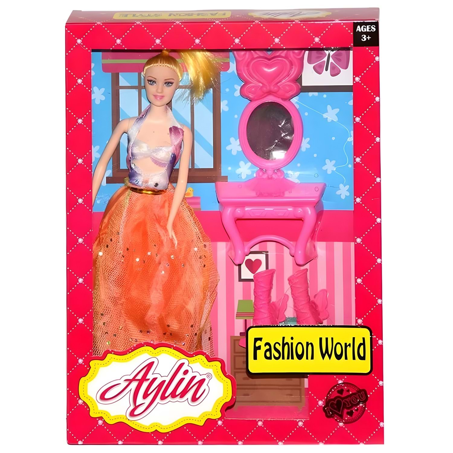 Aylin Bebek Fashion World serisi, şık elbisesi ve aksesuarlarıyla çocukların hayal gücünü geliştirir. Set içerisinde bebek, ayna, masa ve modaya uygun parçalar bulunur. 3 yaş ve üzeri çocuklar için idealdir.