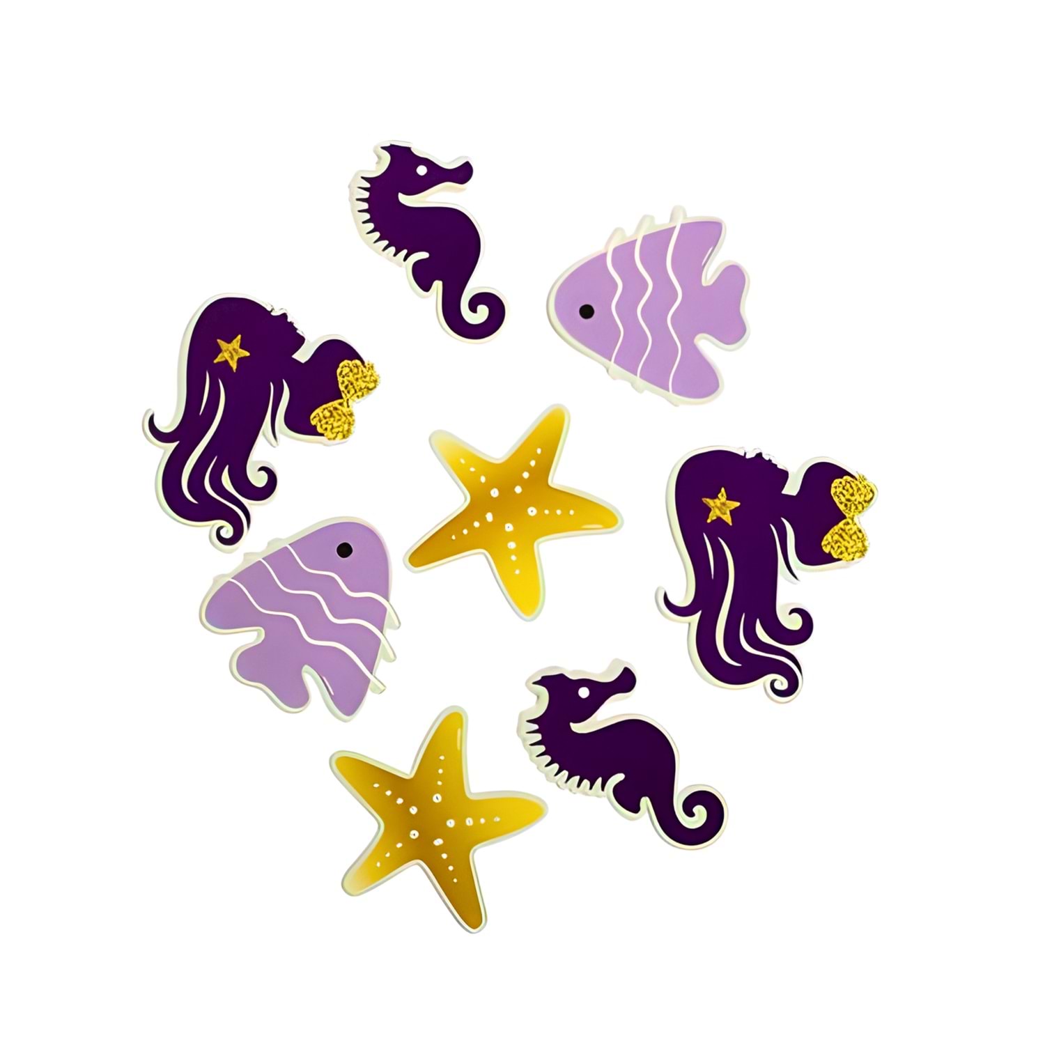 Pırıltılı Deniz Kızı ve Deniz Canlıları Süs Seti – 8 Adet | Mor ve Altın Renkli Tema Aksesuarları | Parti, El İşi, Dekorasyon