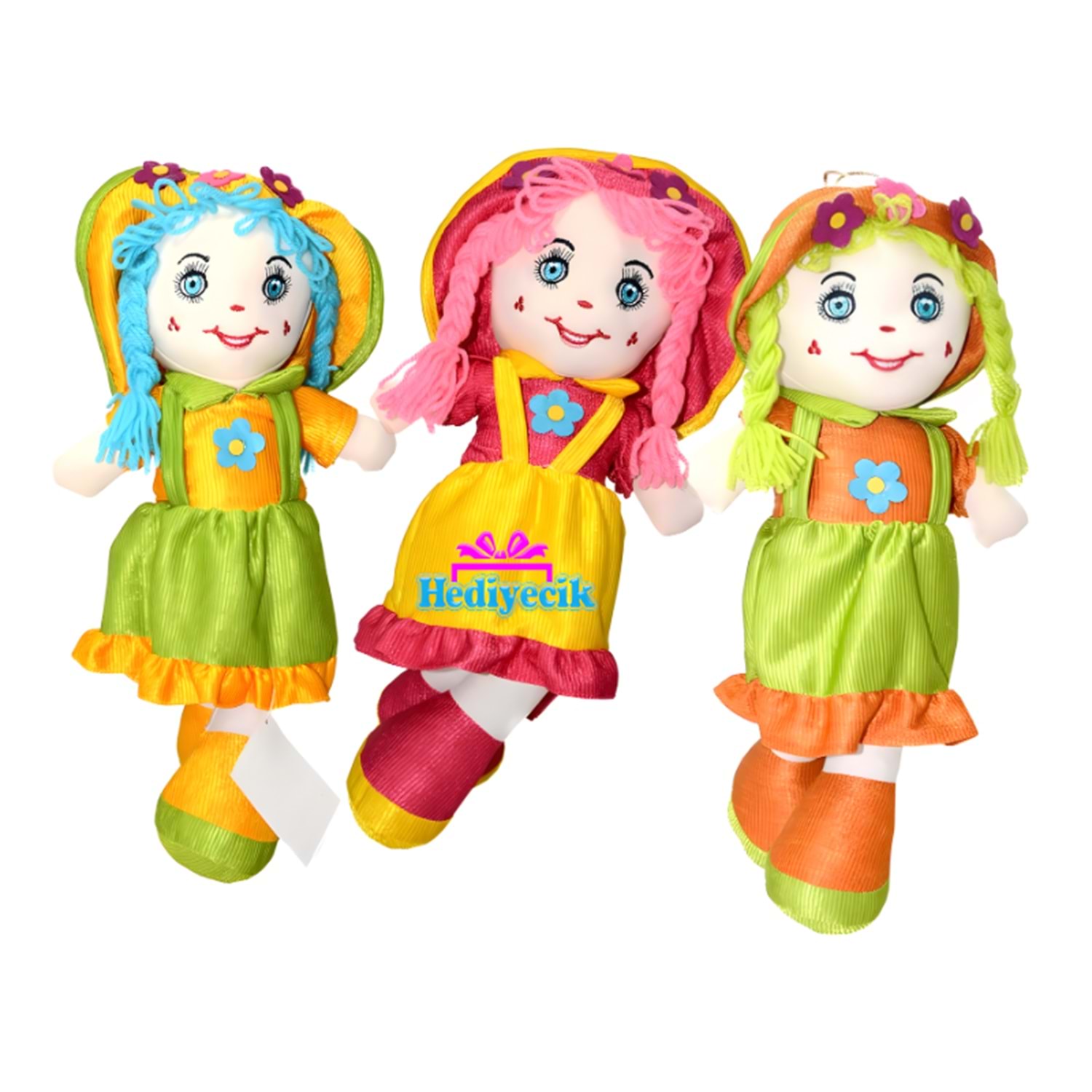 Uzun örgülü saçları, çiçekli şapkası ve rengârenk elbisesiyle dikkat çeken bu bez bebek; oyun kurmayı seven çocuklar için harika bir arkadaştır.