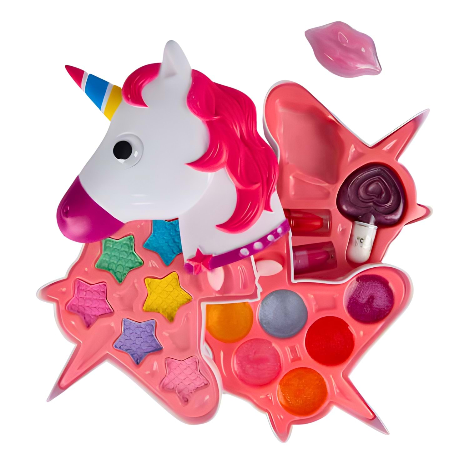 Renkli unicorn tasarımıyla dikkat çeken bu 3 katlı makyaj seti; far, allık, ruj ve minik aksesuarlar içerir.